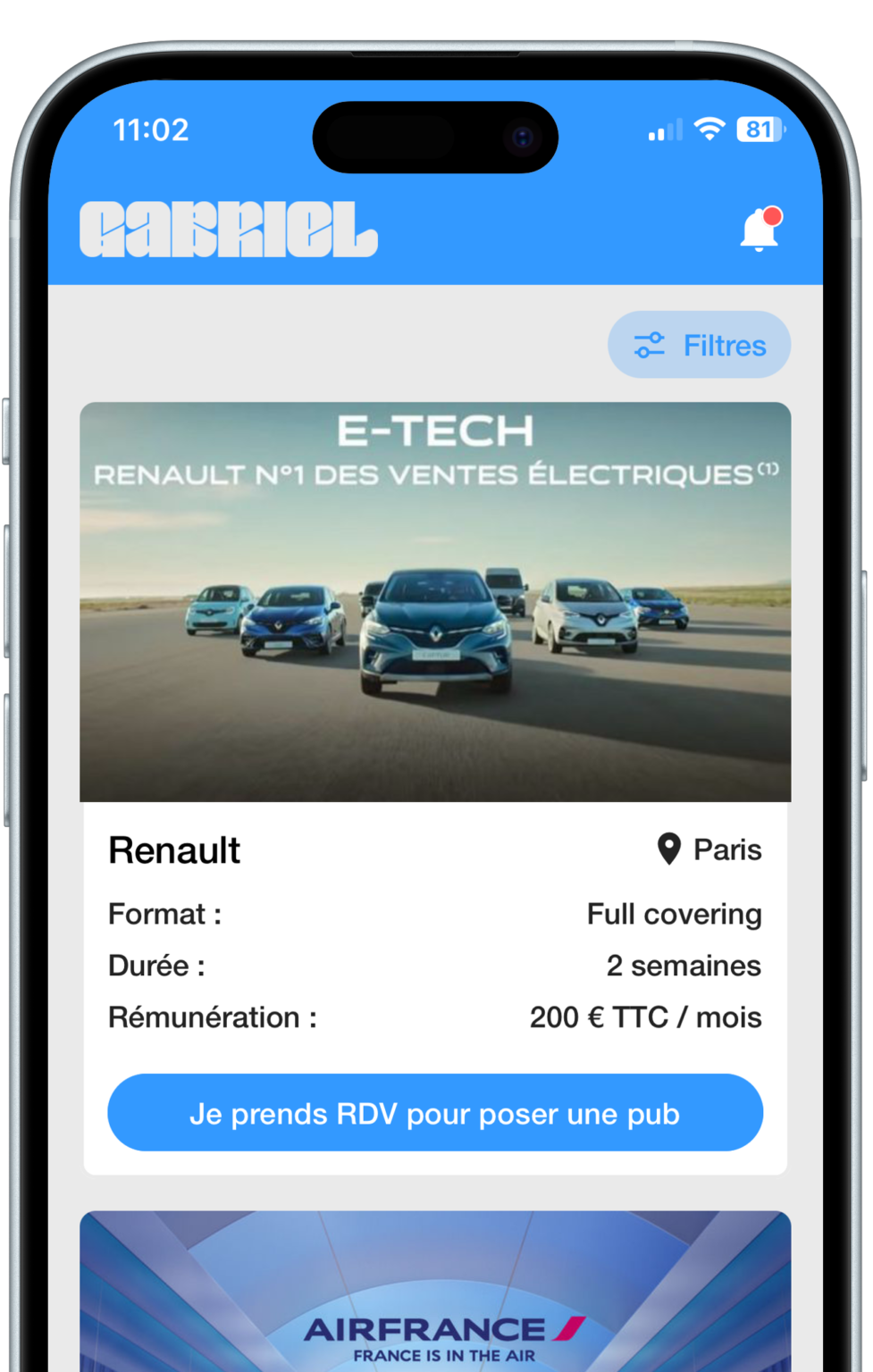 En téléchargeant Gabriel, optimisez votre rentabilité avec des mises à disposition et trajets récurrents rémunérés. Et gagnez jusqu’à 250€/mois grâce l’affichage publicitaire sur votre véhicule.